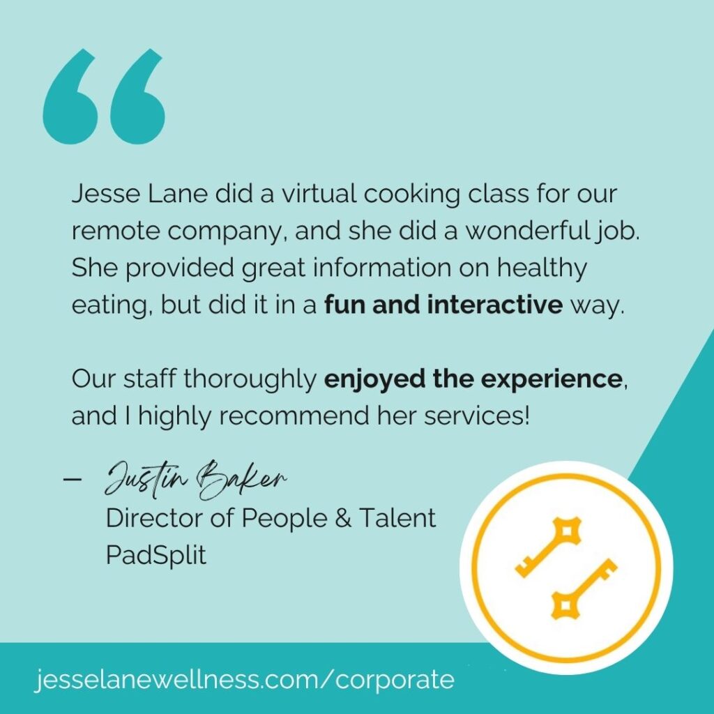 Why just talk about healthy eating when you can actually do it?! This hands-on, cook-along session turns all this health information into action. I will guide your team through the preparation of a delicious, restaurant-worthy meal from the comfort of their own kitchens.