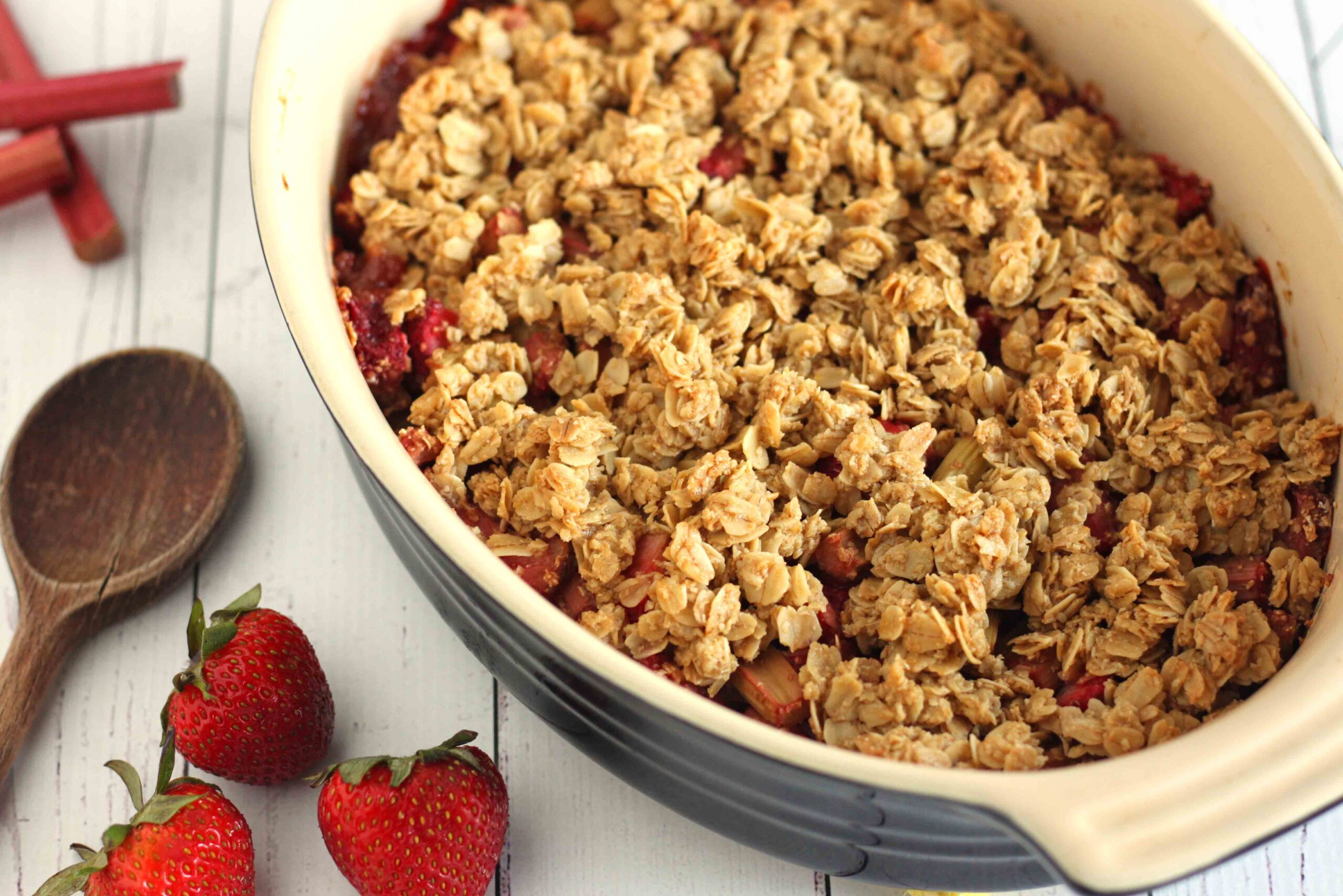 There is always an abundance of two things in my house in the early summer, strawberries, and rhubarb. Both of these delicious foods are in season right now, making them inexpensive to buy, way more flavourful, and super nutritious to boot! And at the end of a long week when I’m craving a weekend treat, I know I can turn to these ingredients to make something special – like crisp!