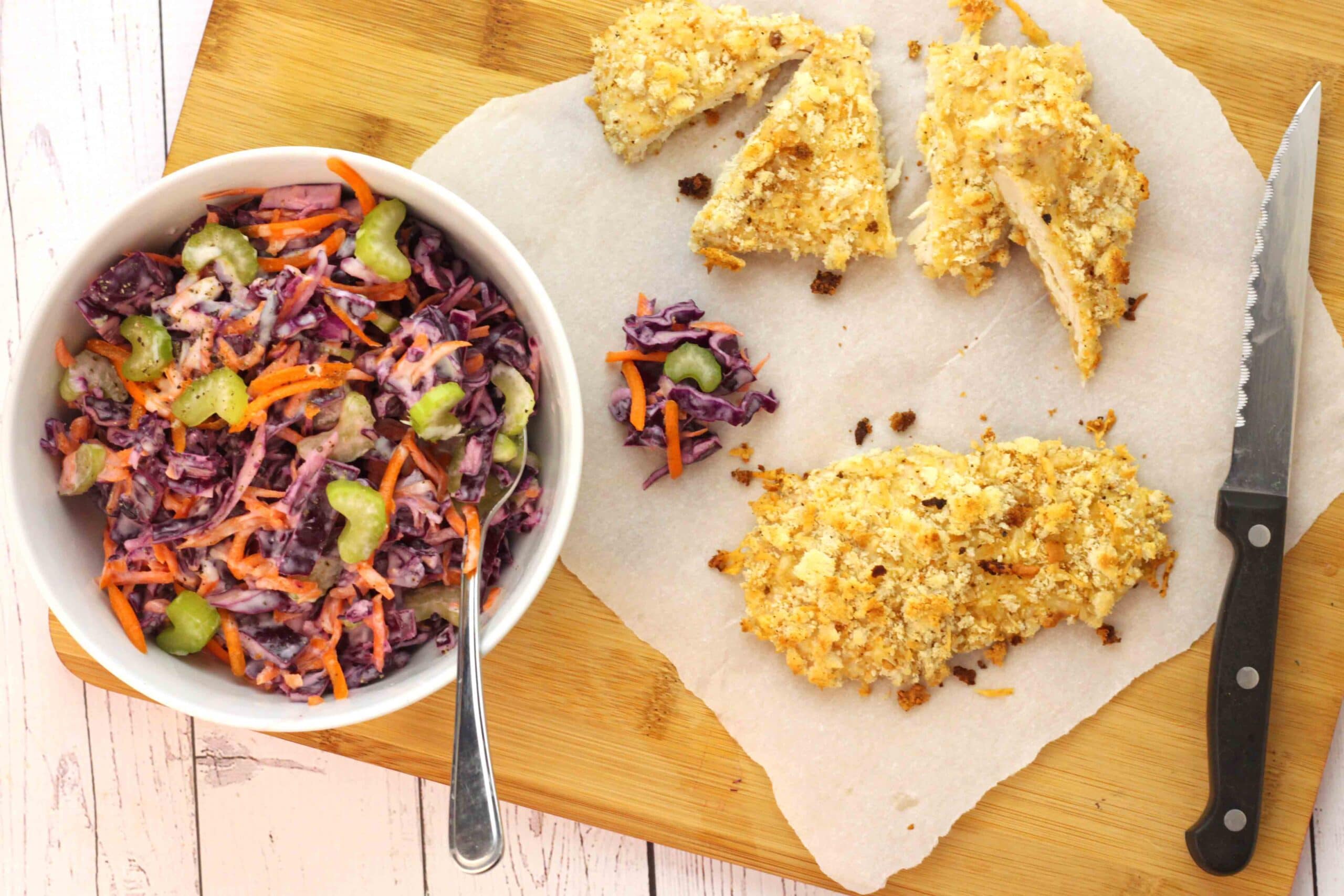 - Crispy Baked Chicken and Purple Slaw (photo above) is a healthy spin on classic fried chicken and coleslaw. The chicken is breaded and baked to crispy perfection. The vibrant purple coleslaw has a Greek yoghurt dressing in place of the traditional mayo-based dressing. Eating healthy doesn’t have to mean hours in the kitchen and long grocery lists. You can make this recipe start to finish in under 30 minutes!